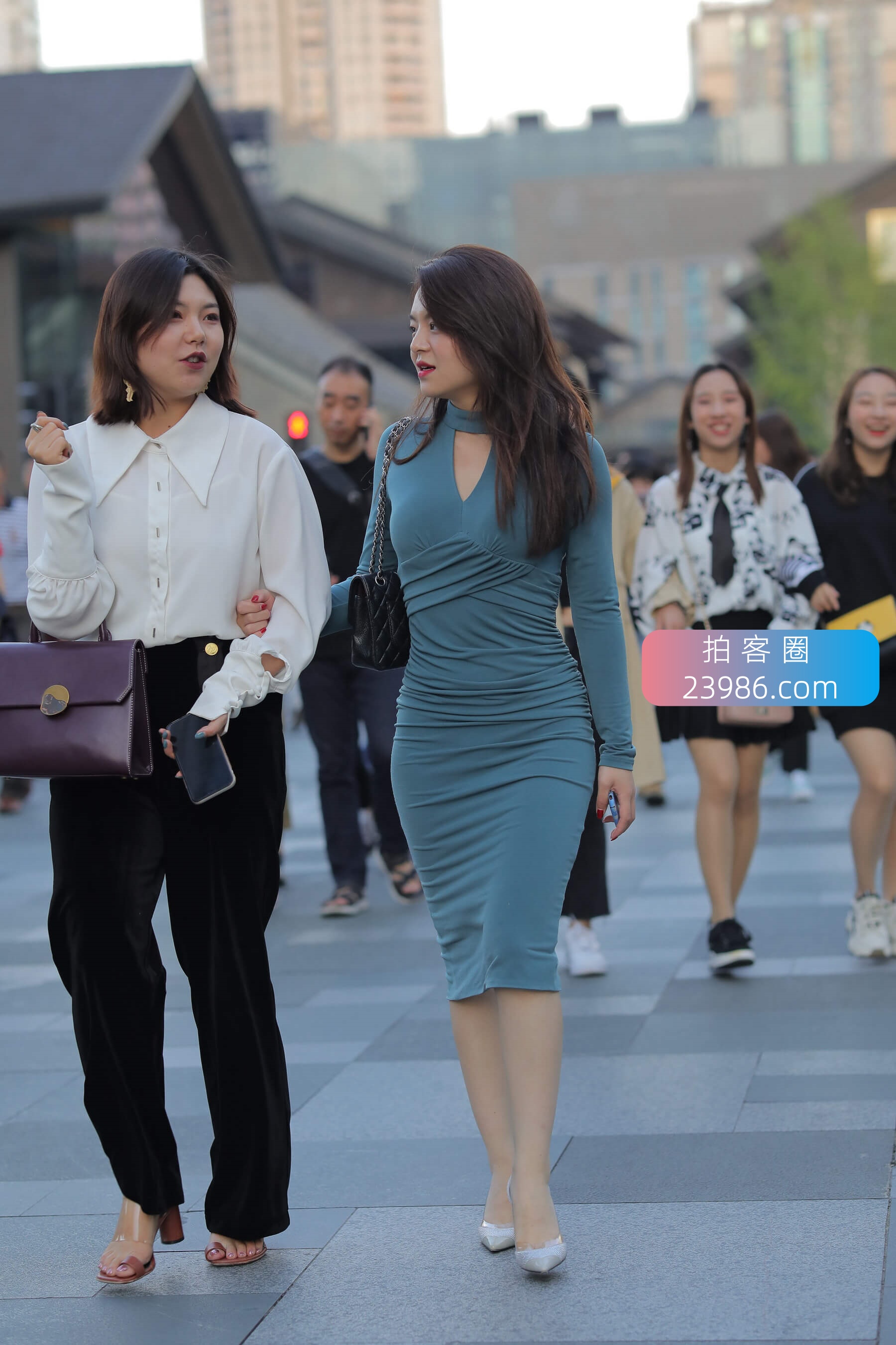 街拍墨绿色包臀裙美姐