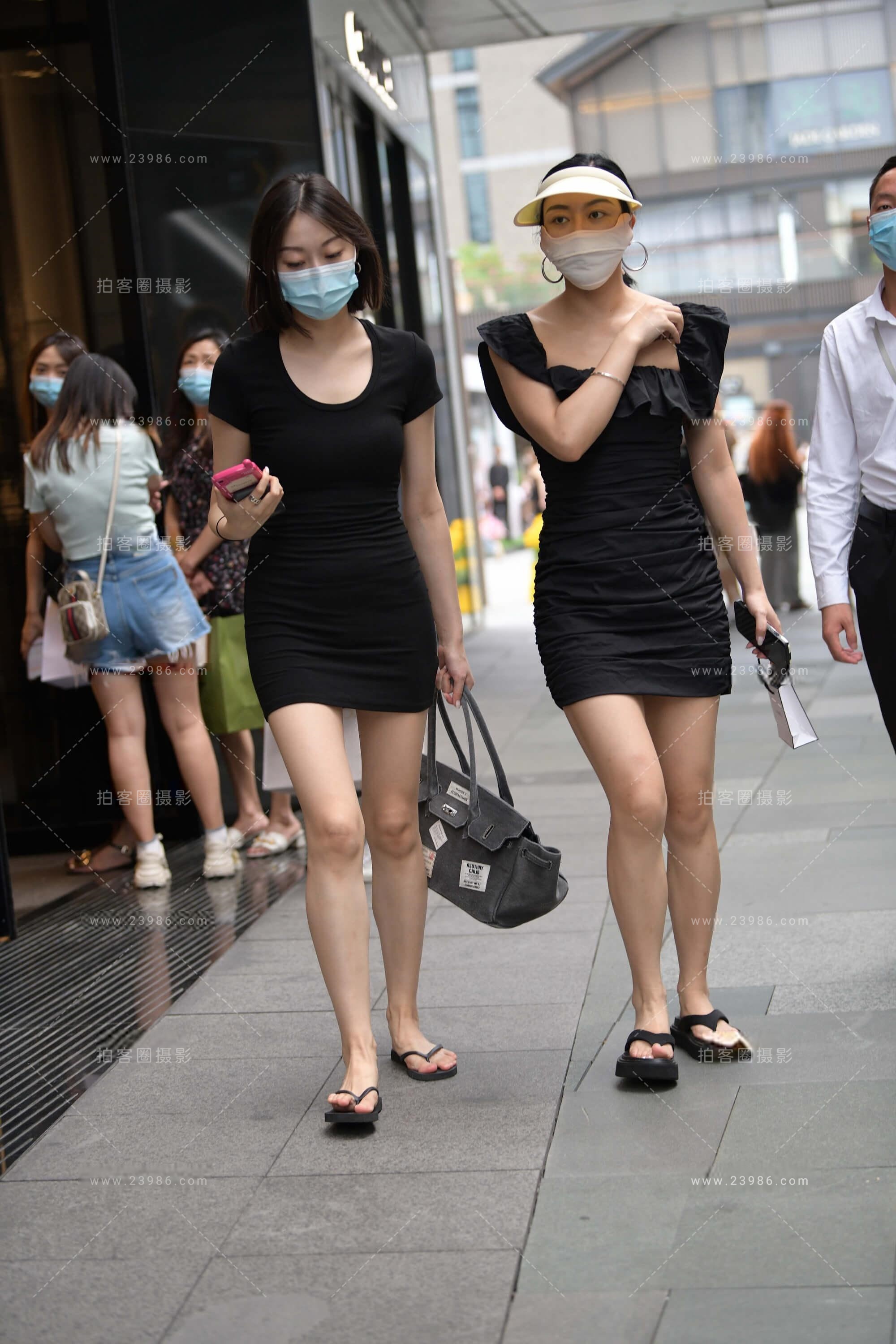 街拍黑色短裙,人字拖美眉