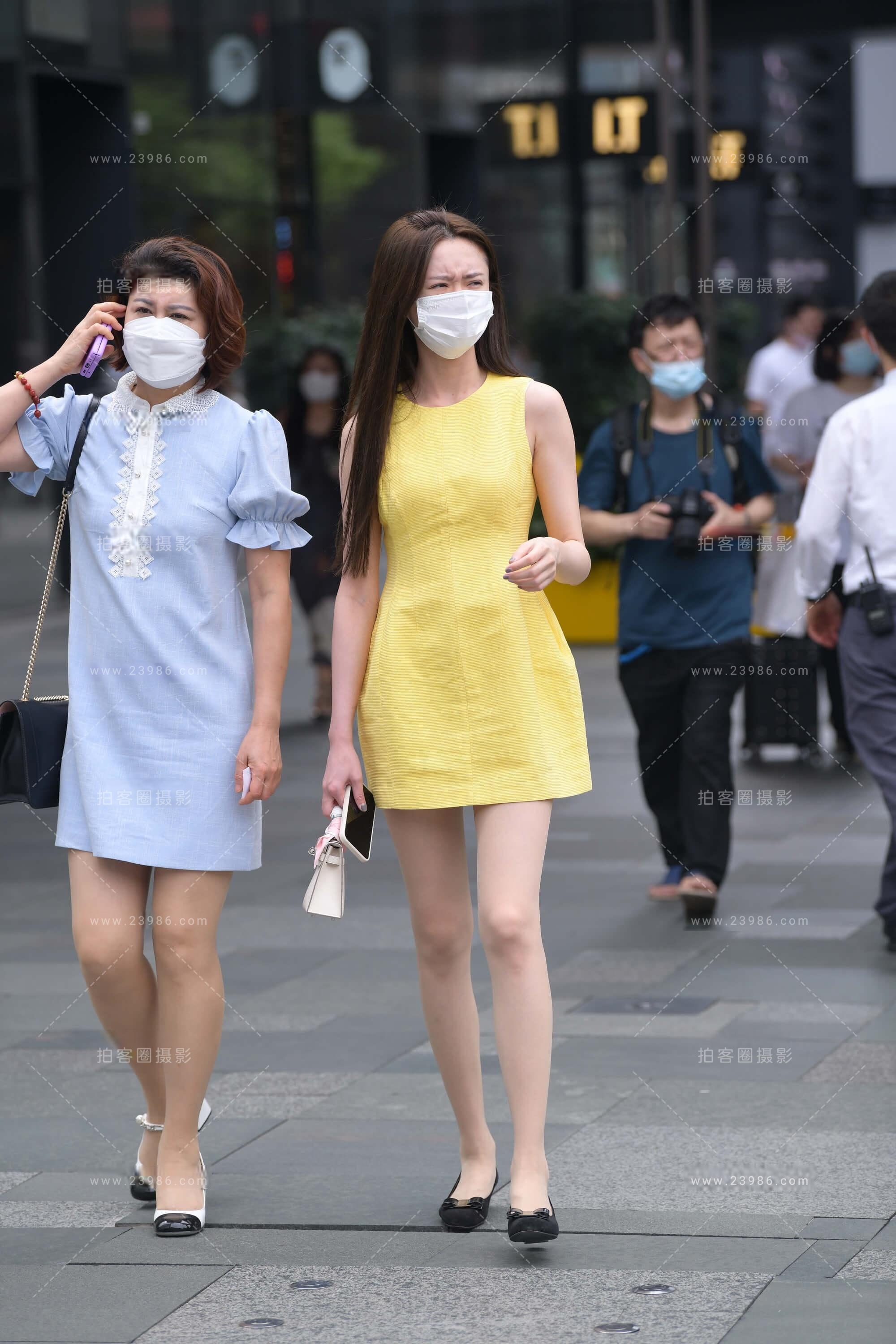 街拍黄色连衣裙R丝小姐姐