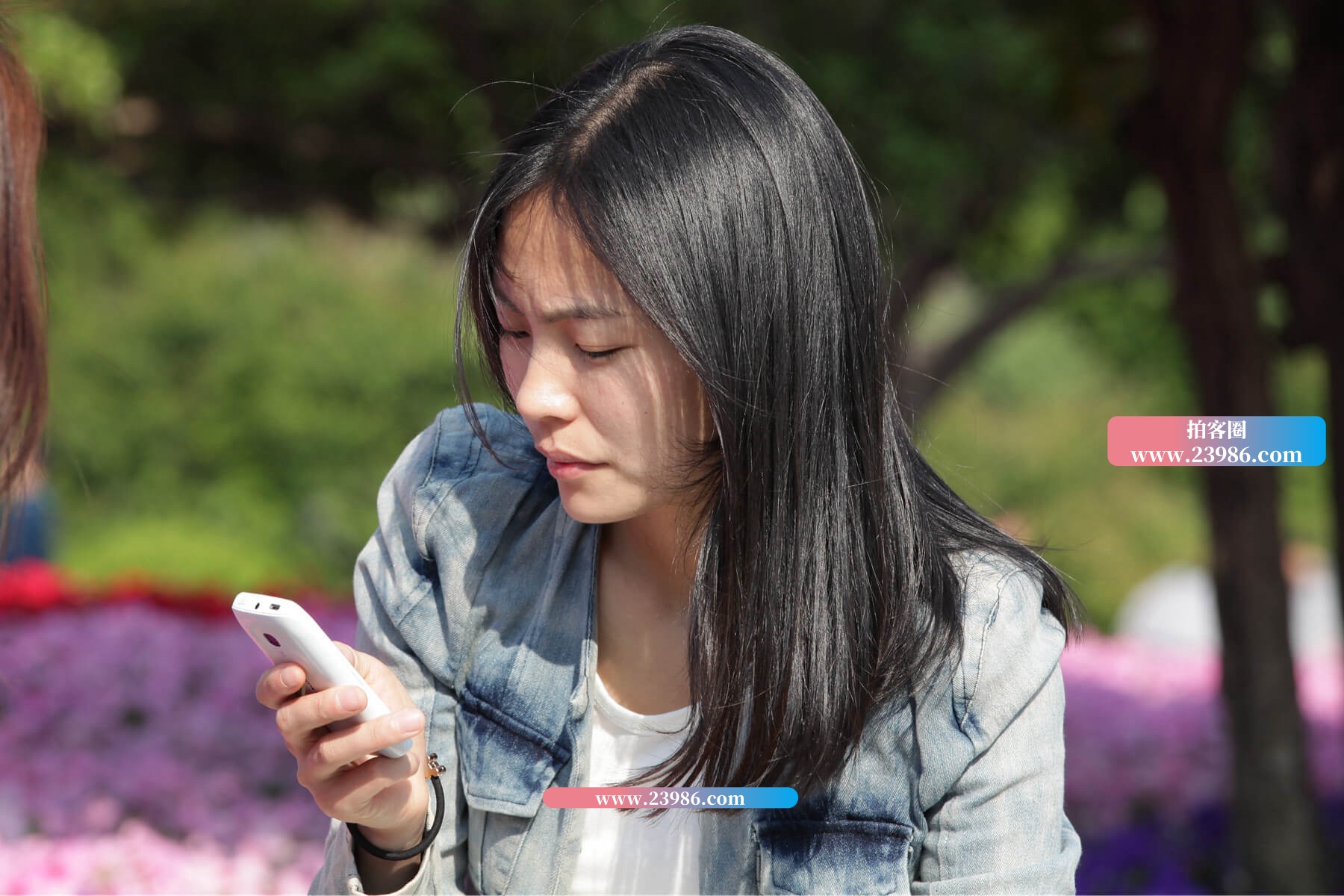 街拍白裤姐妹长椅上闲聊
